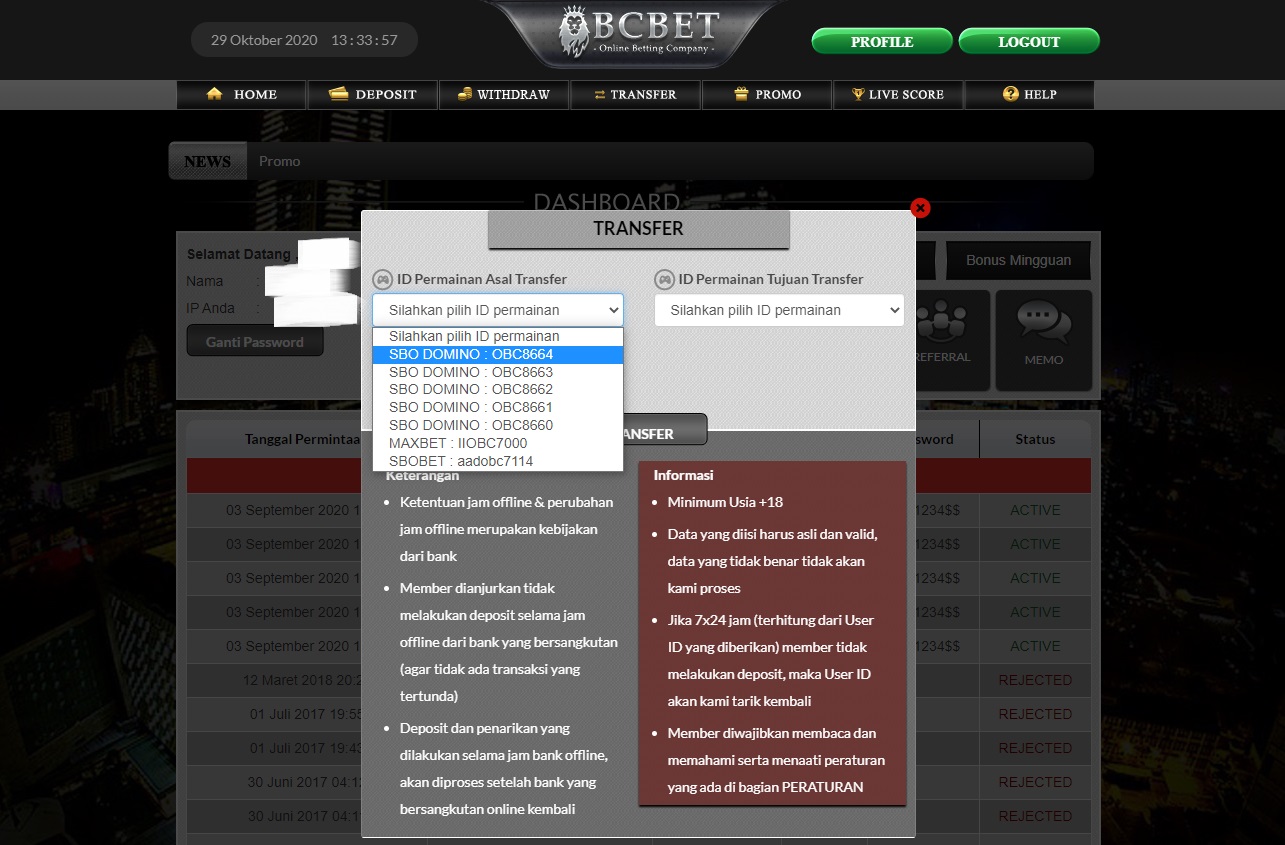 Transfer hanya dapat dilakukan jika Anda memiliki lebih dari satu ID permainan. Untuk mengetahui lebih lanjut mengenai cara menambah ID permainan. Transfer adalah proses memindahkan kredit permainan dari satu ID permainan anda ke ID permainan anda yang lain. Proses transfer kredit dapat dilakukan meskipun bank sedang offline. Untuk melakukan transfer, anda diharuskan untuk melakukan login kedalam akun OBCBET terlebih dahulu. 1. Di halaman depan OBCBET, Anda akan menemukan form login. Isi Username dan Password yang anda gunakan pada saat pendaftaran. 2. Setelah terlogin, Anda akan dibawa ke halaman Dashboard, kemudian klik tombol TRANSFER yang terdapat di sebelah kiri. 3. Popup Form Transfer akan muncul, pilih User ID sumber dana / kredit anda , pilih User ID tujuan dana / kredit, masukan nominal yang ingin Anda transfer. Pastikan semua data sudah benar . 4. Jika semua data sudah benar, klik tombol Transfer yang terdapat di form transfer.